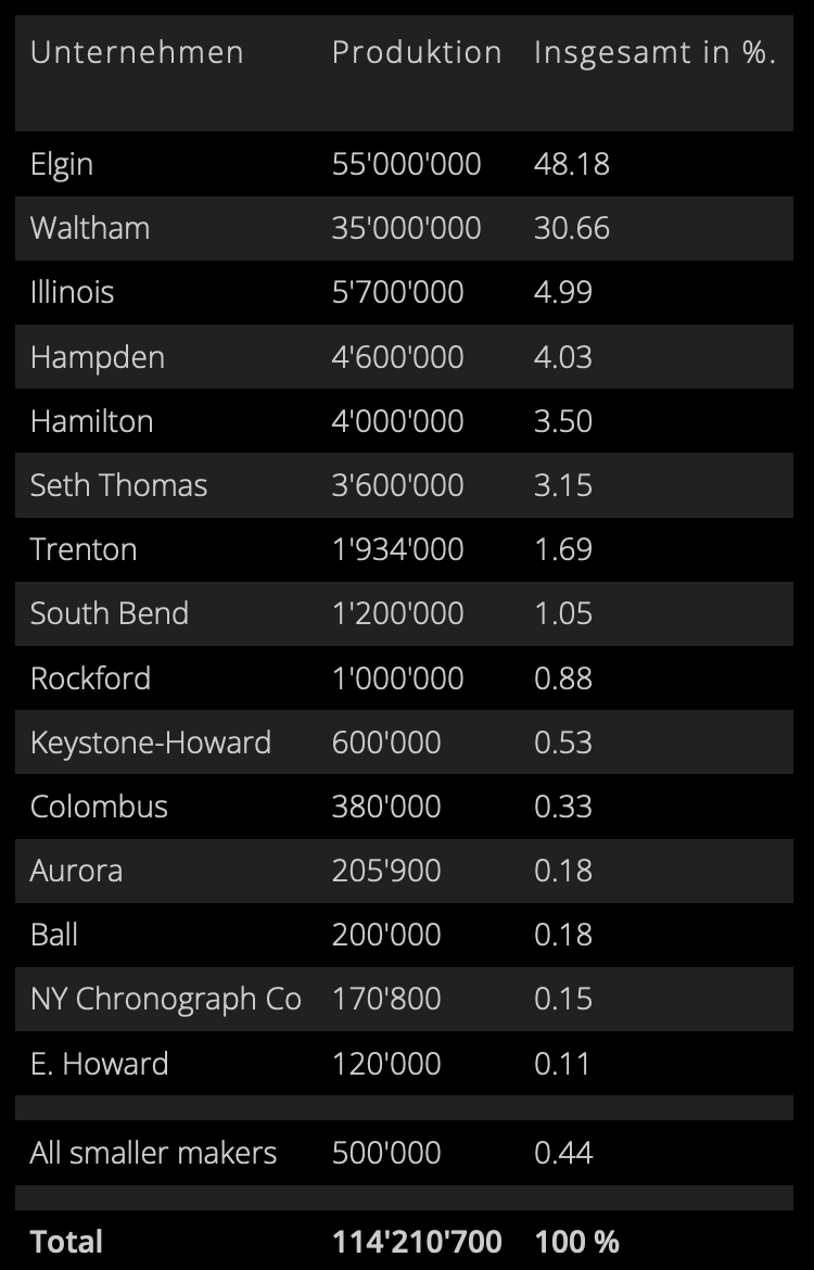 Um 1900 lehrten die fünf größten Firmen der USA (Waltham, Elgin, Hamilton, Illinois u. Hampden) nicht nur die Schweizer das Fürchten. Sämtliche Konkurrenz aus Europa wurde zu weitreichender und schmerzender Rationalisierung gezwungen.